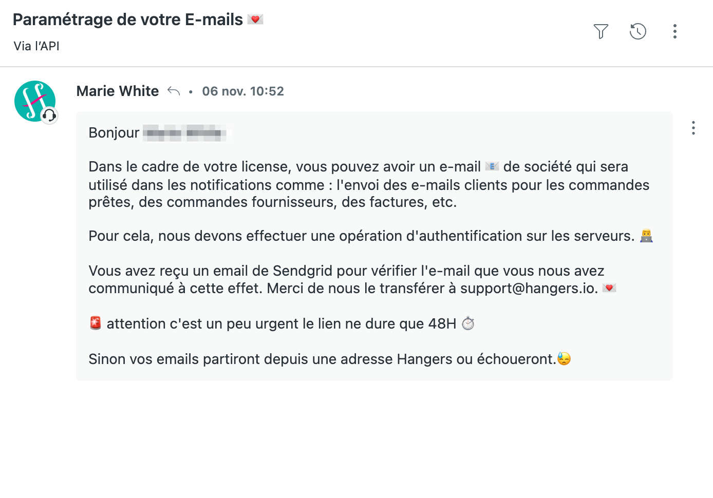 ↪ Il faut TRANSFERER à support@hangers.io . Vous recevrez alors un nouvel e-mail du support pour vous confirmer que tout est bon " Nous vous félicitons ! Votre identité d'expéditeur a été vérifiée avec succès. "